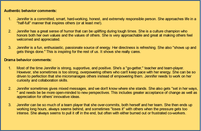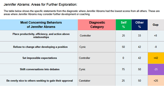 The Areas for Further Exploration section identifies the specific interaction skills where the user needs the most work. This section uses color-coding to highlight those areas where the user sees himself / herself much differently than third parties. The numeric values are on a 0..100 percentage scale, where “0” is most concerning and “100” is most healthy. The “gap analysis” helps the user see where he or she is either too hard on self or has a blind spot.
