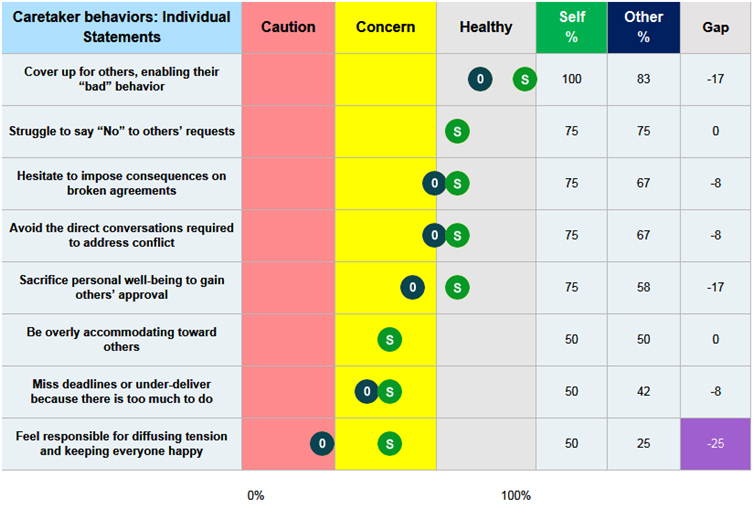 The report also displays a summary graph for each interaction category, showing the user’s assessment compared with the third parties’ assessment for each category statement. The statements are sorted from “most healthy” to “most concerning.” An example category graph is shown below: