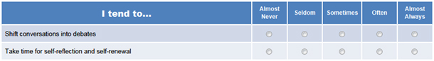 The Drama Diagnostic assessment consists of several statements about a person. For each statement the user must select one of five options. For example: